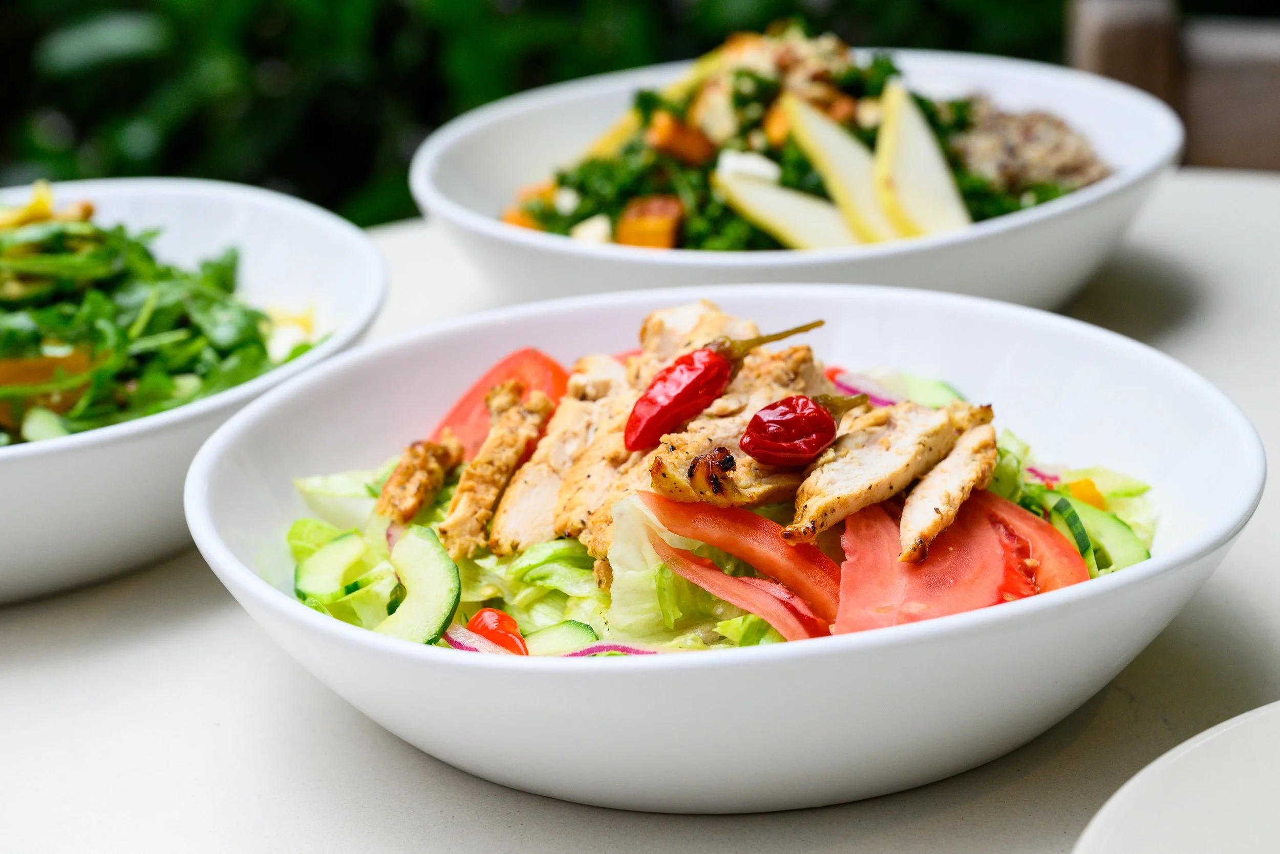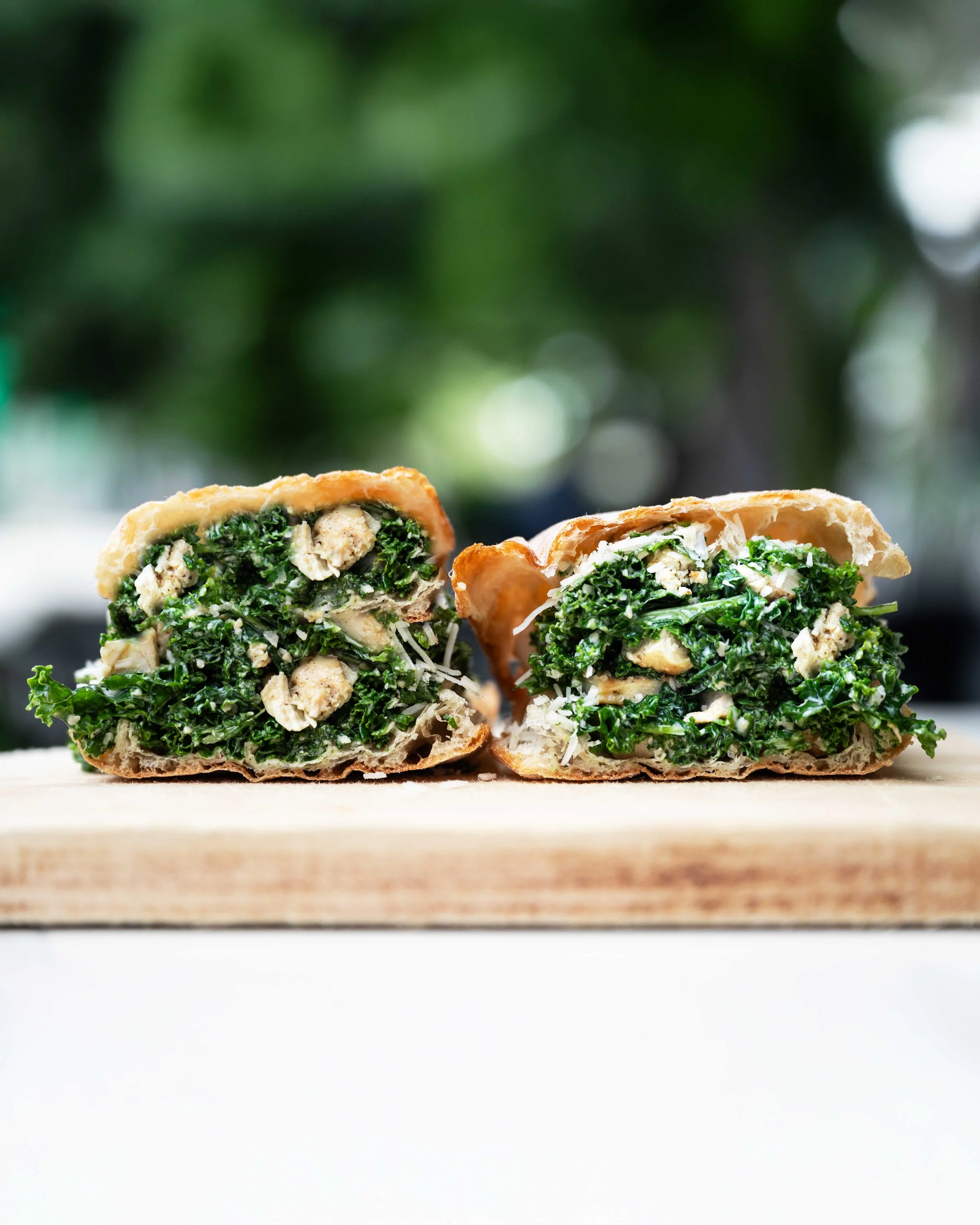 Oven-baked chicken, kale, pecorino cheese, Caesar dressing.