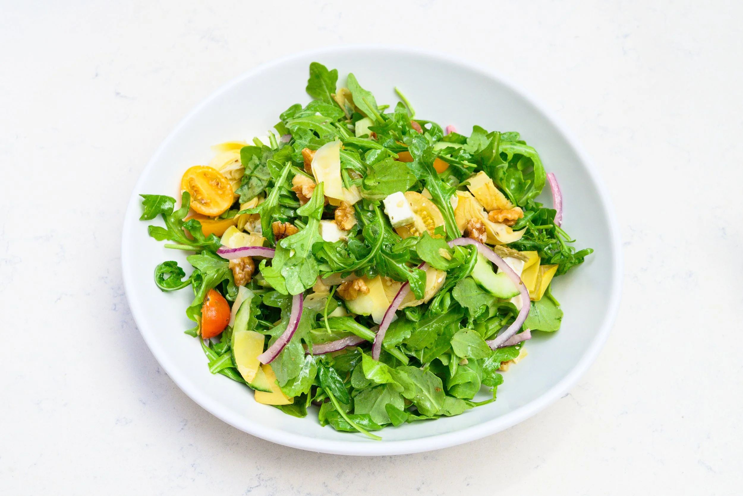 Arugula, artichokes, cucumber, tomato, red onion, walnuts, Greek feta, lemon dressing